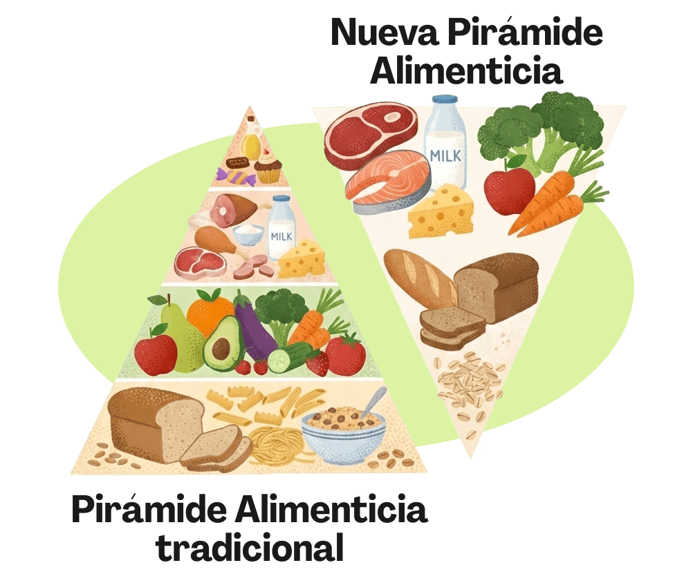 LA NUEVA PIRÁMIDE. La nueva pirámide alimenticia de EE. UU., impulsada por la administración actual, invierte prácticamente por completo la pirámide que conocíamos hasta ahora. Se recuperan alimentos que habían sido demonizados: la mantequilla, las carnes rojas, los huevos y la leche entera vuelven a tener protagonismo. En cambio, los productos ultraprocesados pasan al banquillo. Se apuesta por una alimentación más natural, rica en proteínas y grasas saludables.