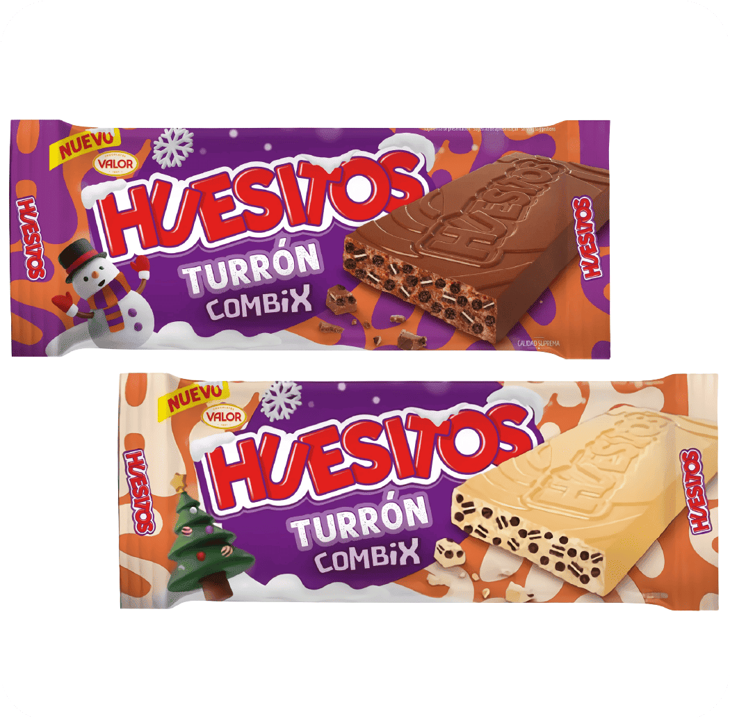 Combinación de su turrón de chocolate con crujiente galleta de cacao y trocitos de HUESITOS COMBIX. |