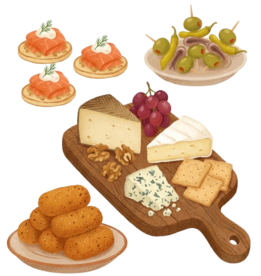 🔸Mini blinis con salmón ahumado 🔸Croquetas de jamón ibérico 🔸Gildas clásicas