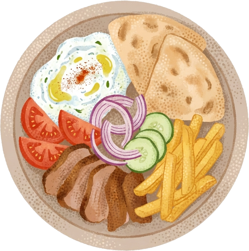 Carne asada (tipo kebab), servida en pan pita con tzatziki, tomate, cebolla y patatas. Muy popular en Grecia como comida rápida, aunque bien hecho es una delicia tradicional. |