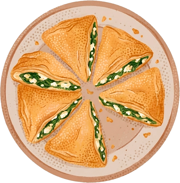 | Empanada de masa filo rellena de espinacas, cebolla y queso feta. Crujiente por fuera y suave por dentro, ideal como entrante o merienda |