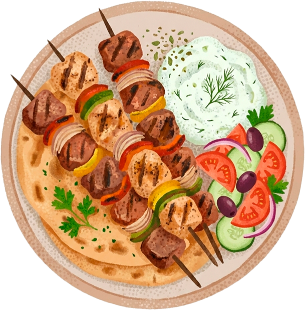 Brochetas de carne (pollo, cerdo o cordero) marinadas y cocinadas a la parrilla. Se sirven con pan pita, salsa tzatziki, y a veces con patatas. Es el “fast food” griego por excelencia. |