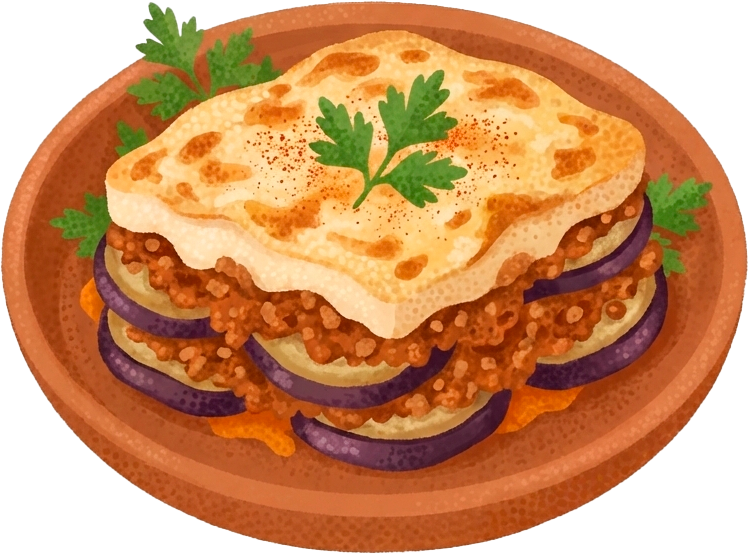 | Uno de los platos más emblemáticos del país. Una especie de lasaña griega. Capas de berenjena, carne picada (normalmente de cordero o ternera) y una bechamel cremosa por encima y se hornea hasta quedar dorada. |