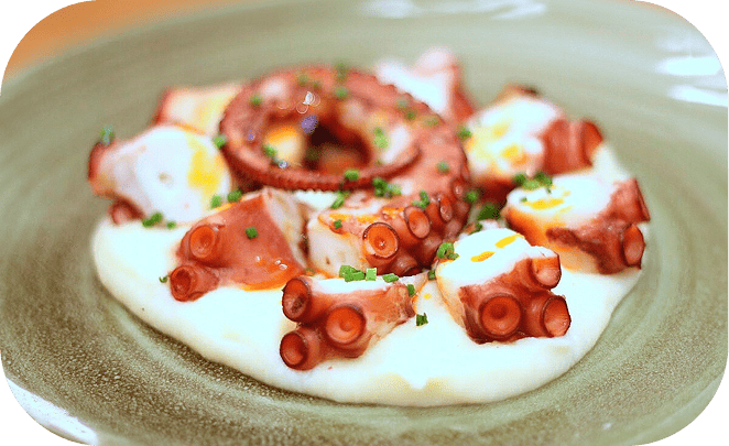 Á FEIRA. El pulpo forma parte de la tradición gallega, donde se sirve “á feira”, cortado con tijera sobre un plato de madera, acompañado de aceite de oliva, sal gorda y pimentón. Sencillo y delicioso.