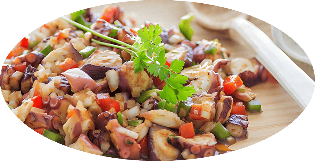 - Agrega al pulpo: 1 ajo picadito, 1 cebolleta en trozos pequeños, Pimiento rojo y pimiento verde picados finos.