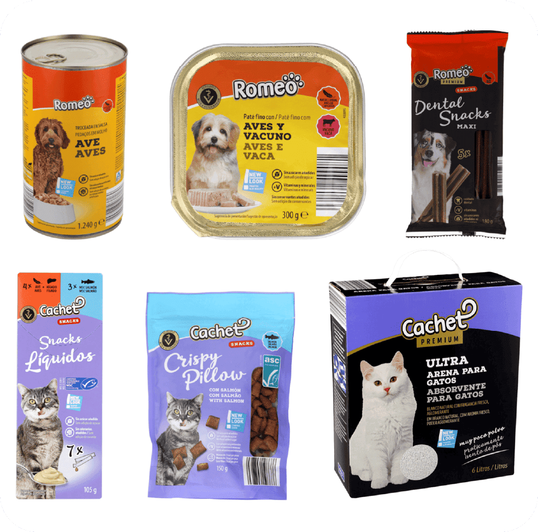 | Nueva comida para perros: comida húmeda, pienso original rico en carne de buey, paté premium y snacks y palitos sin azúcares añadidos. Nueva comida para gatos: paté, comida en salsa, mousse y snacks líquidos y crujientes. |