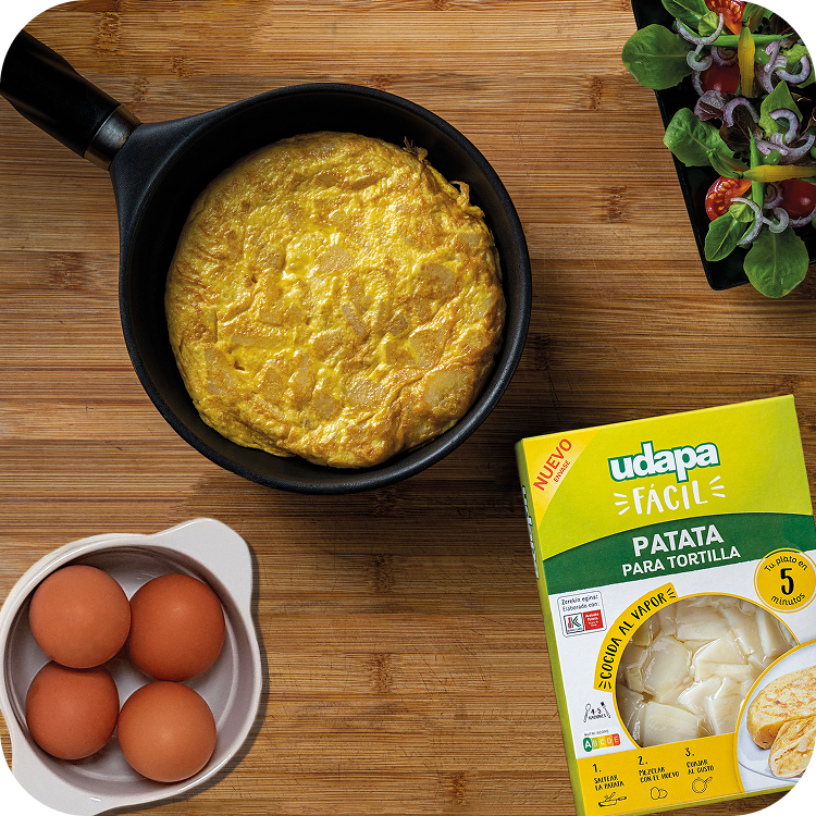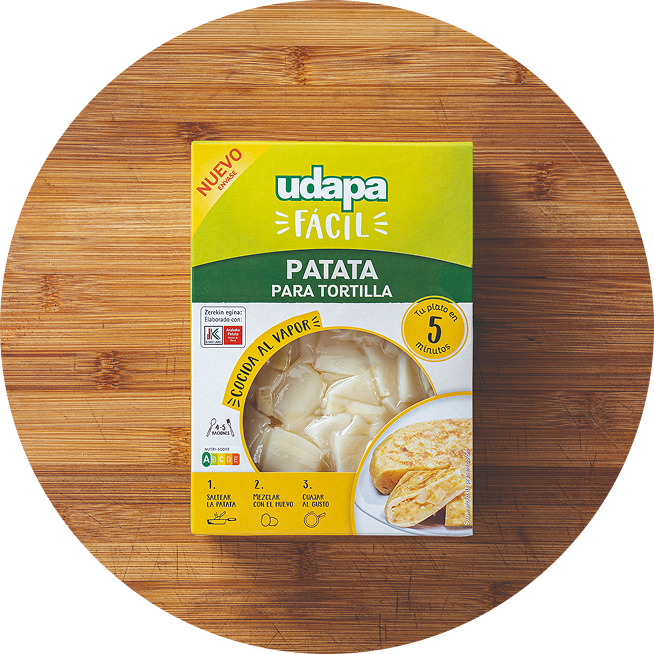 LISTA PARA AÑADIR. ¿Ganas de tortilla pero poco tiempo? Udapa te lo pone fácil con su patata cocida para tortilla que ya viene pelada, cortada en finas láminas, cocinada al vapor y envasada al vacío. Nada de conservantes, colorantes ni alérgenos. Es un producto 100% natural que conserva el sabor, el olor y la textura de la patata fresca.