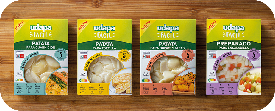 RESTO DE LA GAMA. Además de la Patata para tortilla, la gama Udapa fácil la completan la Patata para guisos y tapas, la Patata para guarnición y el Preparado para ensaladilla, en el que los dados de patata vienen acompañados de guisantes y zanahoria. |