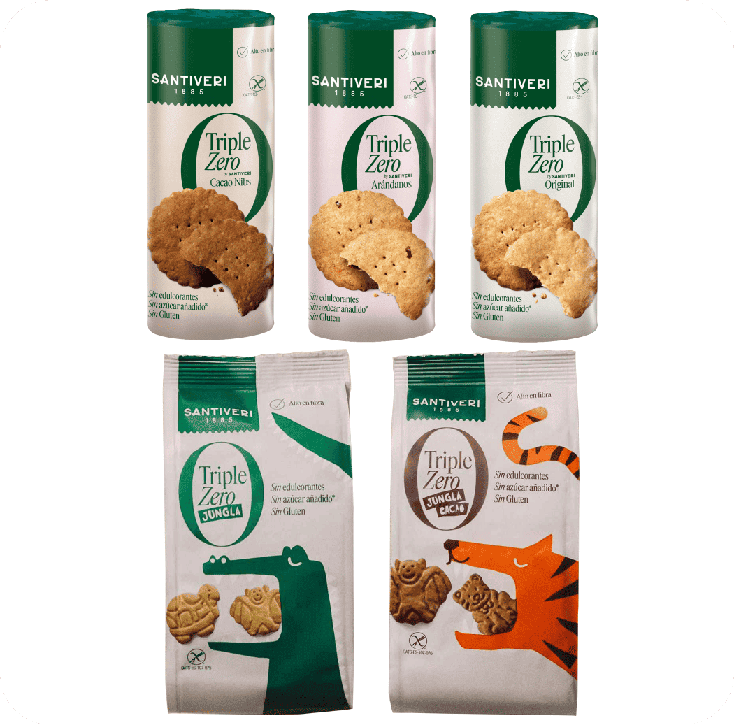 | Galletas saludables sin azúcares añadidos, sin edulcorantes y sin gluten. Disponibles en 3 variedades: original, cacao y arándanos. |